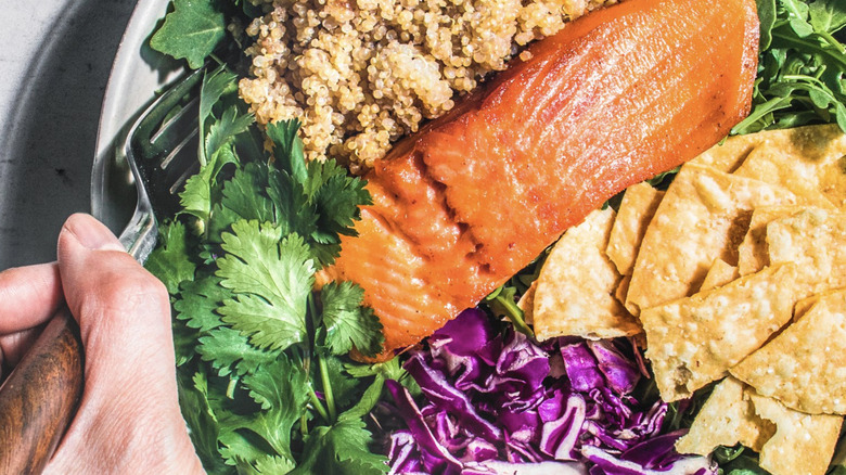 At Sweetgreen, there are many different offerings where you can try steelhead trout in the Pacific Northwest. It comes with the chain's Miso Glazed Steelhead Protein Plate with the likes of avocado and pickled onions, if you're in the region. There's also the Fish Taco Bowl that comes with shredded cabbage, tortilla chips, and quinoa, among other toppings. You can also add the miso-glazed steelhead trout to any of the other salads or plates. And if you prefer steak instead of fish on top of your salad, here's the cut of steak Sweetgreen uses in its dishes, which can be a costly option.