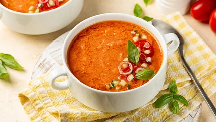 Gazpacho is a healthful vegetarian dish as none of the vitamins or minerals in the tomatoes and cucumbers are lost via cooking. As each ingredient is used in its raw state, using the best vegetables you can find will lead to the tastiest soup. Having said that, plenty of flavor will also come from the fresh garlic, herbs, and vinegar blending up with the veggies.