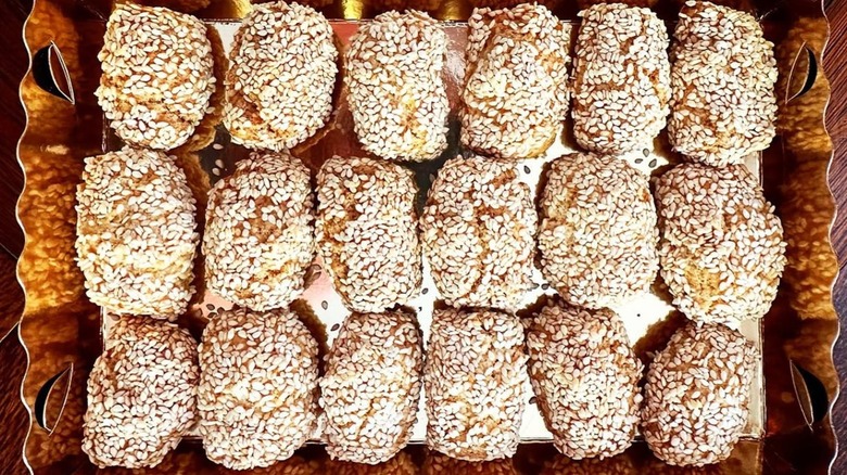 Biscotti regina means "queen's biscuits" and the recipe originated in Palermo, Sicily. They were given the moniker in honor of Italy's Queen Margherita of Savoy, who reigned in the late 19th century and was an admirer of sweet cookies. The treat has a crunchy and sesame seed-covered outer layer and a soft but crumbly interior. The biscotti flavors include vanilla, lemon or orange zest, and sugar. Eggs, butter, milk, and flour are also included in the recipe, but olive oil can be added to the dough mixture, too. Sweetness is key but the cookie shouldn't be overpoweringly sugary; it also offers a savory sesame kick with each crispy bite.