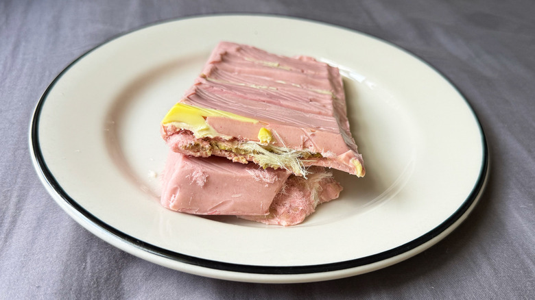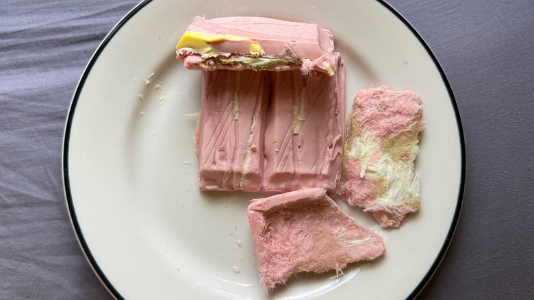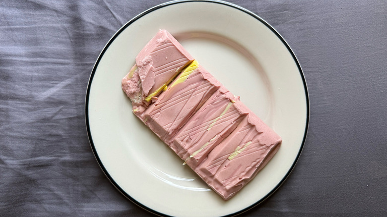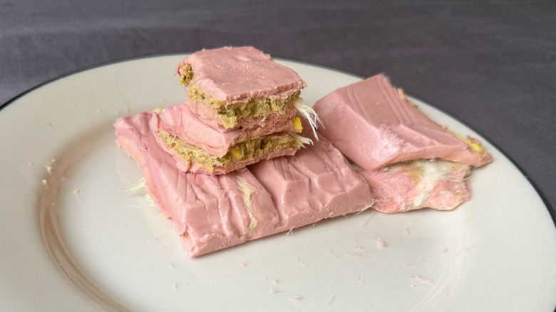 Angel hair chocolate bars are stuffed with pistachio butter and pişmaniye, or Turkish cotton candy, which is made by pulling sugar combined with flour and butter or ghee to create thin strands. (If you're familiar with dragon's beard candy, which went viral back in 2023, it's a very similar confection.) The candy exterior can be anything from white to ruby to milk or dark chocolate and is sometimes flavored like raspberry, as is the case with the BeeMax-brand angel hair chocolate bar I tried.