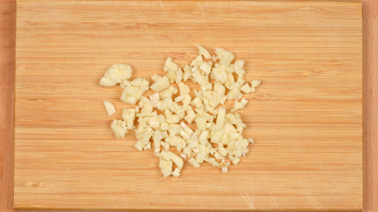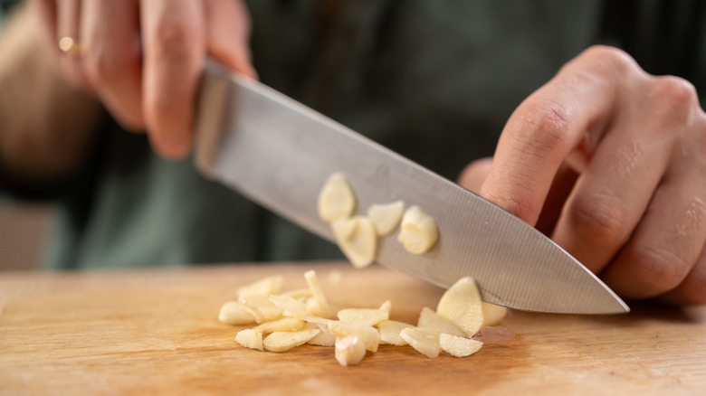 A lot of us settle into comfortable routines when cooking. That's not inherently a bad thing: Routine means we can cook on autopilot, while still monitoring the kids or fielding a work-related call. It's a way to stay organized and on track, but there are times when you need to change things up — cooking with garlic is one of them. You may usually reach for a garlic press, or smash the cloves and coarsely chop them, but take a moment to consider how you're going to use the garlic in your dish. You might not know it, but the way you prep your garlic affects its taste.