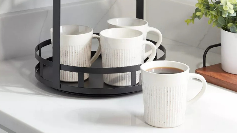 If you're tight on room in the cabinets and want to optimize available counter space, there's a simple yet innovative addition you can add to your kitchen: a tiered lazy Susan. In particular, when used as an organizational mug holder, the revolving element with a host of levels can show off your mugs with a playful touch. The same turntable mechanism that's used to rotate serving plates at the center of a dining table, or to easily swivel a cake as you frost, can double as a kitchen space saver, making it easy to spin through options to hold your morning coffee (literally).