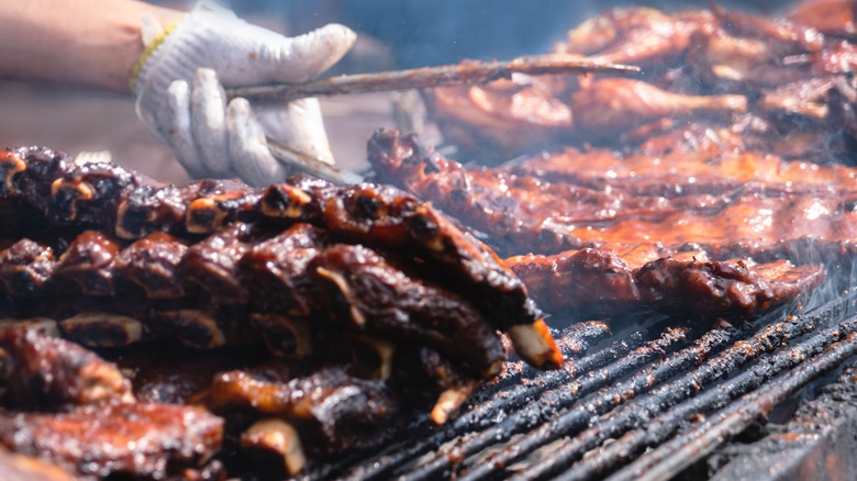 The second half of your spare rib smoking involves flipping them over to ensure all that connective tissue is properly broken down. To do that, Franklin recommends that when the ribs appear "a little tacky," you "wrap tightly, meat side down, in foil with a bit of warm barbecue sauce and a splash of apple cider vinegar and place back on the cooker." Then, leave the ribs to cook for "about 2 more hours or until you can feel them getting almost tender through the foil." While a pitmaster like Franklin can give us time and technique tips, he notes that part of making great barbecue spare ribs is just developing a feel for it, admitting that "this part is very tricky and really takes some practice."