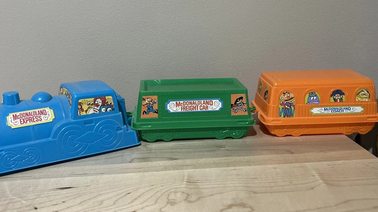 The same year McDonald's released the Playmobil meals came the McDonaldland Express. This train depot was run by none other than Ronald McDonald, with Grimace, Mayor McCheese, and the Hamburglar in tow. This was the first of many non-cardboard Happy Meal containers, with each "box" being a mini plastic train. There were four different train cars to collect, each a different color and style, with dozens of stickers to customize each car.