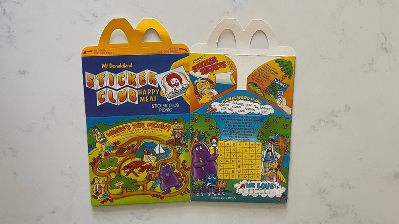Sticker collecting was all the rage in the '80s and '90s, and McDonald's really helped nurture that. Just like the Ship Shape boats, this 1985 Happy Meal came with sticker sheets, but here, they were the main attraction. The Sticker Club Happy Meal box featured tons of classic activities like word searches and connect the dots, but it also came with a pack of stickers kids could treasure and trade. Every box had a unique theme like "sticker club picnic" and "trading days," with each featuring a different setting for customers to stick and display their stickers.