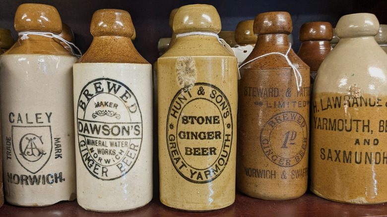 From teal bottles that shine in the light to sturdier pieces of stoneware, beer wasn't always packaged in the kind of glass you might be familiar with. Though spotting a collectible bottle can be a tricky task, true collectors have developed tricks of the trade. The opening of the bottle and the shape, plus the type of closure used to seal the bottle — a cork, screw top, or crown — can provide some indication of its age. So can the base of a bottle and the mold seams, which are the lines that run alongside the length of a bottle can also provide clues to its age. Generally, the higher the seam carries, the newer the bottle, while the newest bottles won't have any visible seams in the glass at all. Read on for 12 collectible beer bottle designs to look for at the flea market.