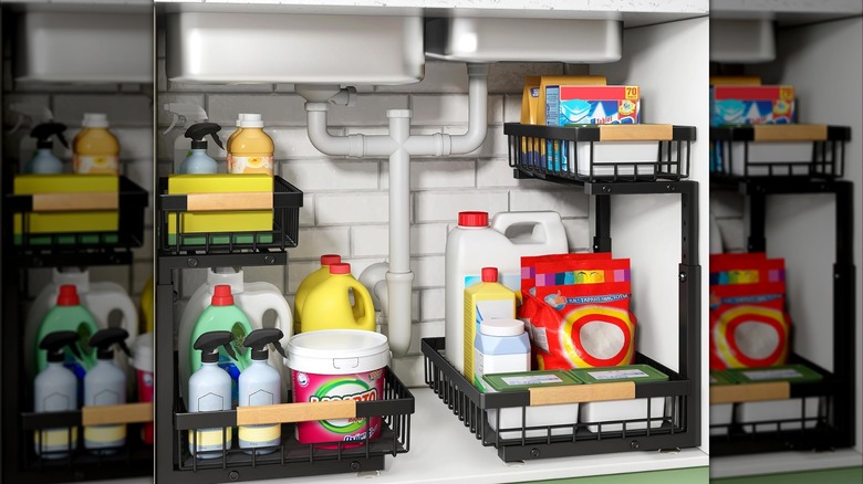 Is the cabinet under your sink a bit of a disaster zone with cleaning products, trash bags, and other supplies piled up however you can cram them in? If so, then the Kitstorack under sink organizer might be for you. Each set includes two pull-out organizers, each with a two-tiered design. They'll make it easy to keep all-purpose cleaners, dishwasher tabs, sponges, and other essentials neat, tidy, and accessible. With the wider lower shelf and narrower upper shelf, they'll fit more easily around the bulkier plumbing and garbage disposals under a sink.