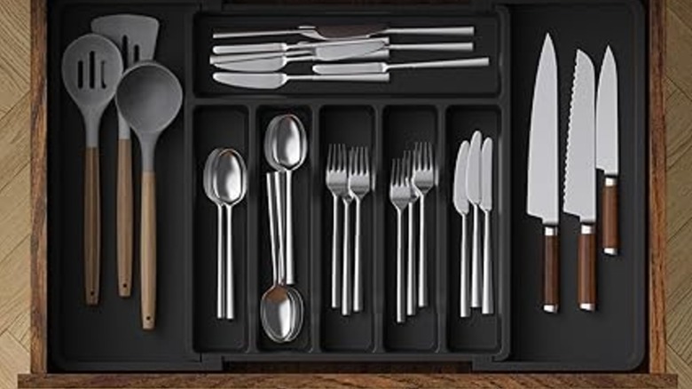 When you're thinking about the various tips and tricks to organize cooking utensils and silverware, you shouldn't overlook the added functionality that a drawer organizer can deliver. This Lifewit silverware organizer is a perfect example. It not only offers six central compartments to hold forks, spoons, knives, and other smaller utensils, but it also features two expandable side panels that will accommodate larger cooking and serving utensils. Plus, with the expandable design, it is also possible to get a more custom fit to the specific dimension of your drawer (it can be adjusted to 13 and 22.4 inches wide).
