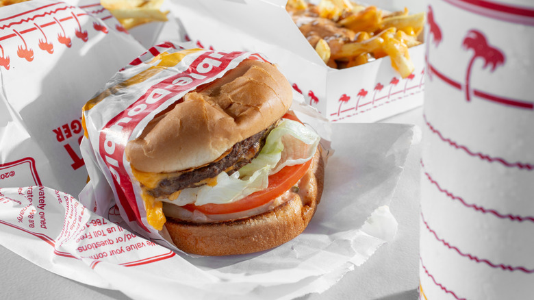 While Flay didn't specifically name which burger he orders, one of In-N-Out's most popular offerings is the Double-Double, which includes two beef patties, two slices of American cheese, iceberg lettuce, tomato, onions, and In-N-Out's proprietary burger sauce. A pro tip for diehard In-N-Out fans: Todd Wilbur's Top Secret Burger Secret Spread is a solid dupe for the signature sauce. For a homemade taste of Flay's favorite fast food burger, however, copycat recipes often agree that In-N-Out's burger sauce comprises of mayo, ketchup, white vinegar, granulated sugar, and sweet pickle relish.