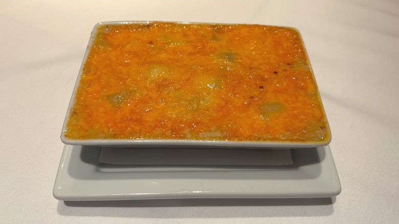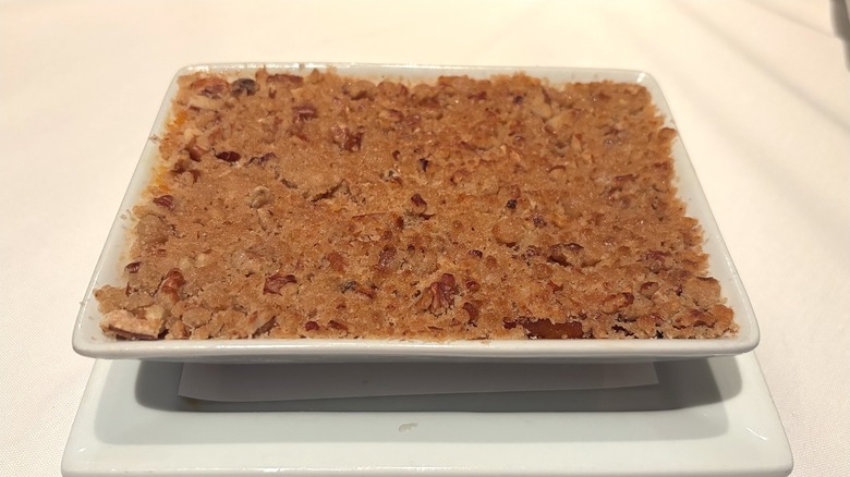I could wax poetic about Ruth's Chris sweet potato casserole for days — nay, weeks probably. It may look unassuming from the outside, but one bite will leave you wondering whether you accidentally ordered something off the dessert menu. This "side" tastes more like an end-of-meal treat than a steak-side indulgence; personally, next time I go in, I'll be ordering a different side with my meal and this for dessert.