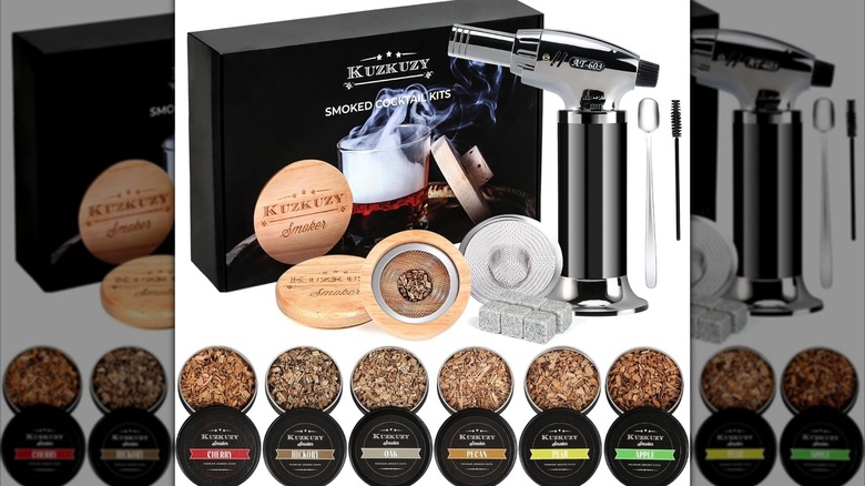 Kuzkuzy offers yet another sleek and budget-friendly cocktail smoker kit. Similar to the Aumpkin model, it comes with a neat-looking wooden chimney, a refillable triple flame torch, six different types of wood chips, mesh screens, and a spoon, which help make the entire kit easy to use. It also comes with a cleaning brush, so it's simple to clean when you're done. It's packaged in a luxurious-looking black box, making it a good gift choice for holidays or birthdays.