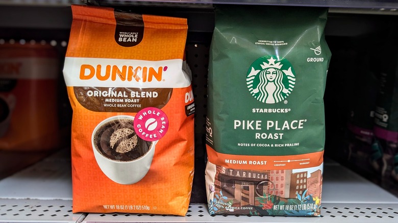 You'll find both Starbucks and Dunkin' house coffees, Pike Place and Original Blend, brewed fresh in-store just about every day. Starbucks guarantees that a hot pot of Pike Place is always on at each location (some locations may rotate offerings), and it's safe to assume that Dunkin' doesn't stray far from its Original Blend as a house coffee, since it doesn't offer a huge selection of other medium roasts. Both coffees are incredibly popular, so they're easy to track down at large retailers like Walmart and Target, too. Or you can just grab a bag of beans or a pack of K-Cups with your to-go coffee at a Starbucks or Dunkin' location.