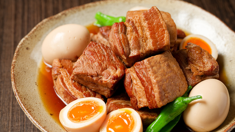 Once you've nailed down the vegetables you're going to incorporate into your bowl of ramen, it's time to consider what protein you want to incorporate into the meal. "For proteins, I personally like pork chashu or kakuni," explains Masaharu Morimoto. Yes, these pork dishes do take some time to make, which is why we suggest prepping your pork in advance of the rest of the ramen. Either of these rich and tender meats is going to make for an especially delicious bowl of ramen.