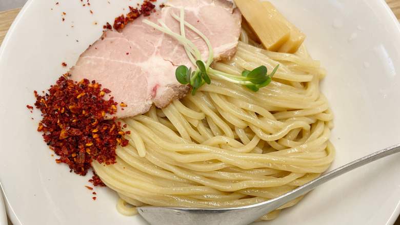 Instead of spending all that time making a pot of broth from scratch, you can simply whip up a flavorful sauce for dipping your noodles. This doesn't have to be a complicated affair — "you just need a flavorful sauce or dipping base like soy sauce, sesame oil, vinegar, and maybe a little chili oil to spice it up," explains Morimoto. And the best part? You can make this type of ramen when the weather may not be ideal for a big bowl of hot, steaming soup. "It's really a great way to enjoy ramen on a hot summer day," he says.