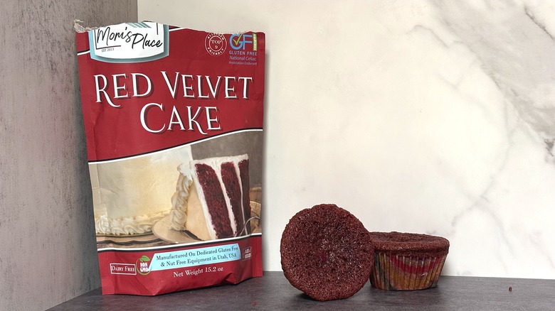 So, if this list were purely based on my personal preference, the red velvet cake mix from Mom's Place would have ranked last. But due diligence requires that I take into account allergen considerations, and this is the only mix on the list that's gluten-free, dairy-free, and top 9 allergen-friendly. However, these free from considerations only apply to the mix — the instructions direct the baker to add dairy ingredients (including buttermilk, butter, and eggs) to the batter, so I'm not sure what the point was of making the mix dairy free. Also, this recipe asks you to add your own red food coloring, which is good to know in case you don't normally keep any on hand.