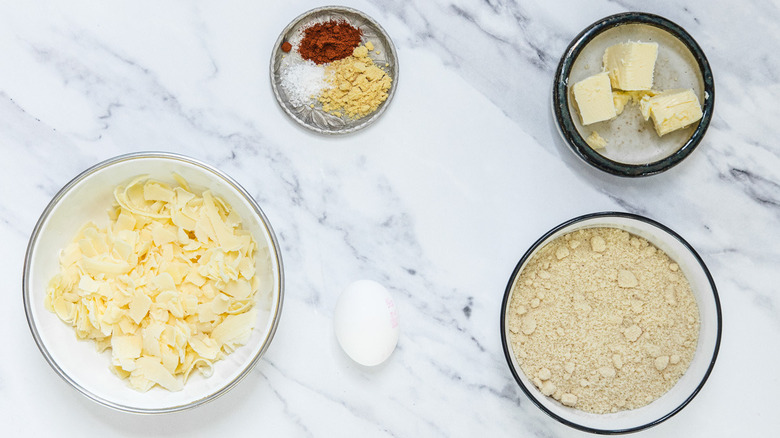 To make these gluten-free crackers, you'll need almond flour, mustard powder, smoked paprika, fine sea salt, grated sharp cheddar cheese, unsalted butter, and a large egg. If you want a touch of hit in your crackers, you can add cayenne pepper to the batter, and a sprinkle of flaky sea salt after baking.