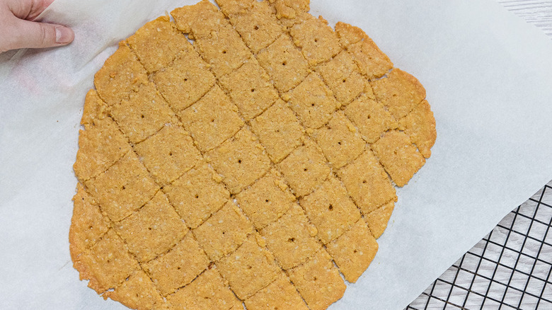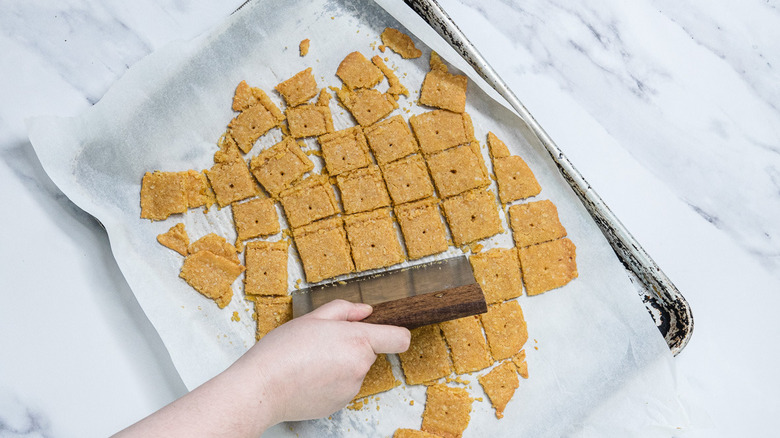 - Let the crackers cool completely about 30 minutes to 1 hour on a wire rack before cutting them again with a knife or dough cutter.