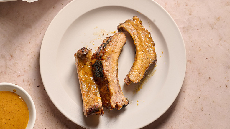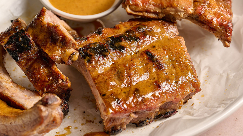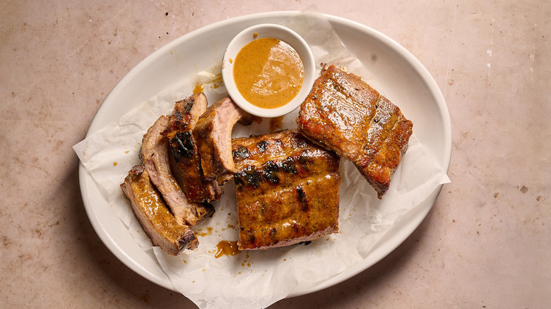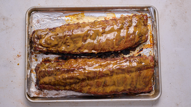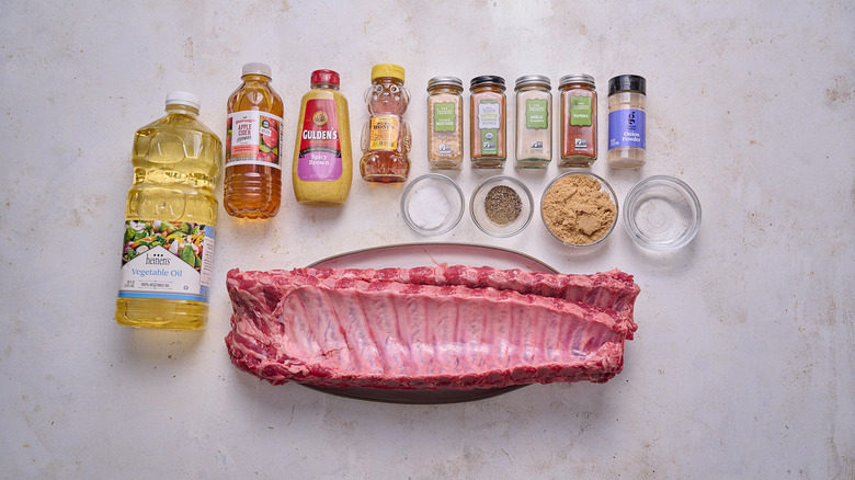 Before anything else, grab two racks of ribs. While buying the ribs, check if the ribs have been prepped with the membrane removed or if you'll need to plan an extra few minutes to prep the ribs yourself. With the ribs bought, the remaining ingredients are simple — so much so that you may already have most of them in your pantry already. Grab salt, pepper, paprika, garlic powder, onion powder, cayenne, and ground mustard; then grab brown sugar, canola (or vegetable) oil, honey, apple cider vinegar, some water, and a bottle of hot mustard to finish the BBQ sauce. The mustard will drive the flavor, so choose a mustard brand and type you love, making sure not to choose one that's already sweet (or if you do, leave the honey out of the BBQ sauce).
