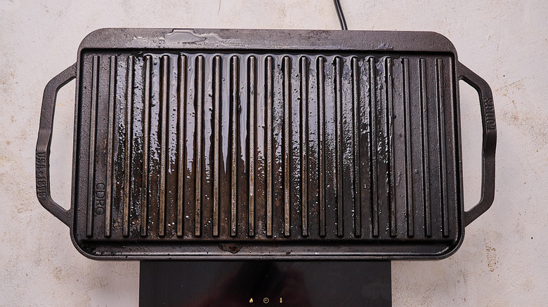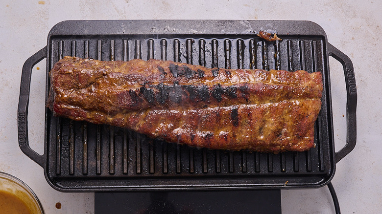 The first and easiest method for browning your ribs is using the broiler. Remove the foil-wrapped ribs from the oven and adjust the rack a few notches higher, just under the broiler, while turning the broiler to high heat. Unwrap the ribs and place them in the oven underneath the broiler, keeping a close eye on them so they don't burn. Flip the ribs and quickly broil the other side, then remove and serve them. Another method you can use is a simple cast iron sear — to do this, carve the ribs into 4 or 5 bone sections and sear, working in batches, on a cast iron skillet over medium heat.