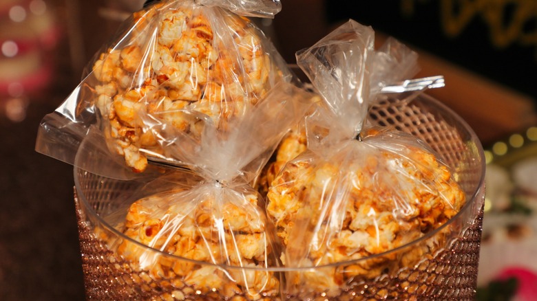 Popcorn balls were another easy-to-make, inexpensive party offering that was sure to please most kids. They were often packaged in cellophane so that kids could take them home at the end of the party. Some parents decorated the popcorn balls with candy according to the party's theme or added bright food coloring to the melted marshmallow mixture. Others just used pre-packaged popcorn balls or caramel corn balls.