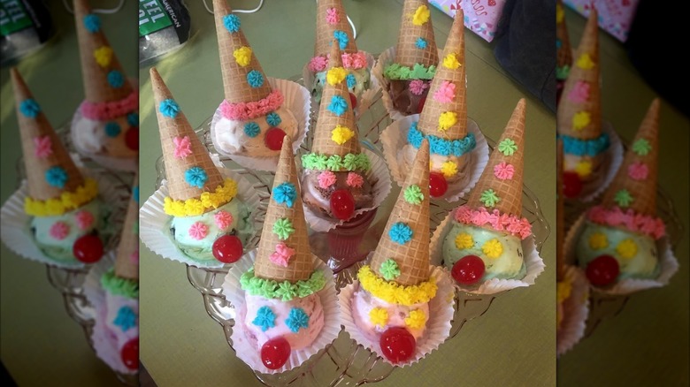If your parents couldn't afford to buy the once-popular Baskin-Robbins' ice cream clown cones, they might have tried to make their own. Homemade clown cones were either cute or terrifying depending on the skill level of the person making them. They were deceptively simple in practice, yet hard to execute properly — especially if they needed to be transported somewhere. Consisting of a scoop of ice cream for the clown's head, a cone for its hat, whipped cream or frosting for a bowtie and collar, and candies for the eyes, nose, and other details, they quickly became more horrifying the longer they sat waiting to be consumed.