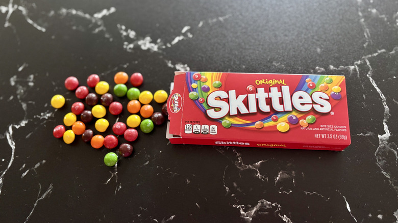 When it comes to fruity candy, it's pretty hard to beat classic Skittles. The chewy, fruity candy outshines competitors like Dots or Mike and Ikes, proving that it's not all that difficult to make a fruit-forward candy that actually tastes good. Plus, with all the successful variations of Skittles out there (like the tropical flavor pack or sour Skittles), there's simply no denying that the candy is a hit and a staple, and this sentiment is true at the movie theater, too.