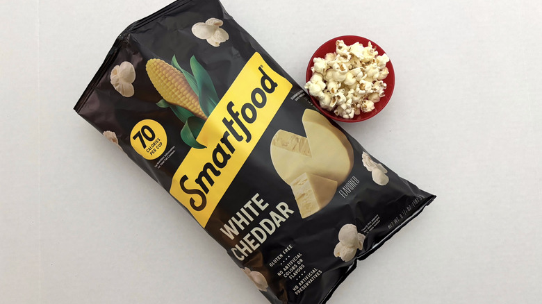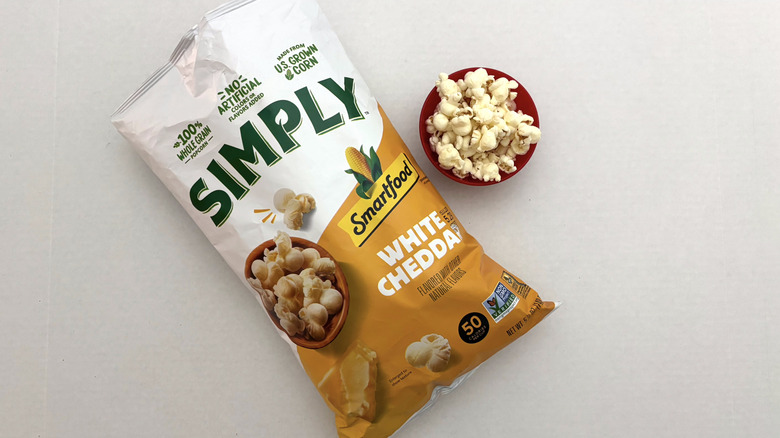 Smartfood Simply popcorn contains no artificial colors, flavors, or preservatives. The white cheddar flavor has only 50 calories per cup and is cleverly delivered in a clean white bag, which is a stark difference from the brand's general black packaging. While the Simply packaging gives off a very natural and healthy feel, the flavor is sadly lacking.