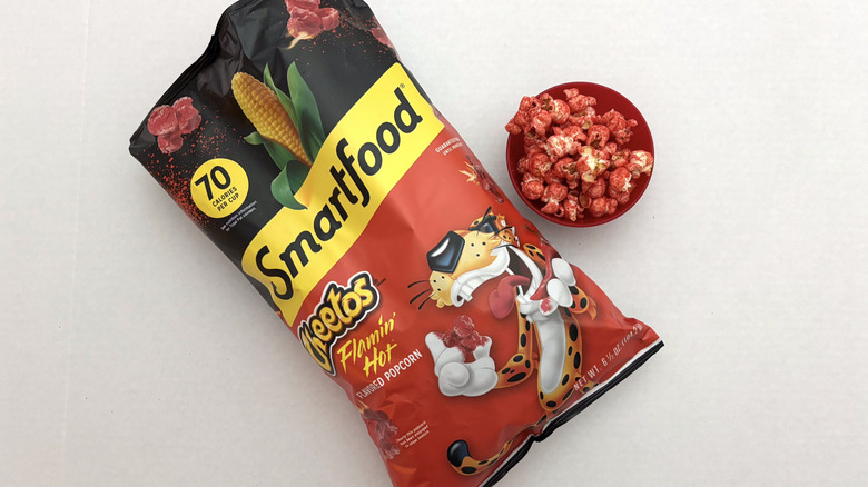The first thing I noticed about this popcorn was the color — a bright, flaming red. And while the color is very accurate to the Flamin' Hot brand, my brain started associating the colorful splashes on the popcorn to a cinnamon-sweet flavor I've seen before in gourmet popcorn shops. So, there was an immediate disconnect for me in what I was expecting to taste.