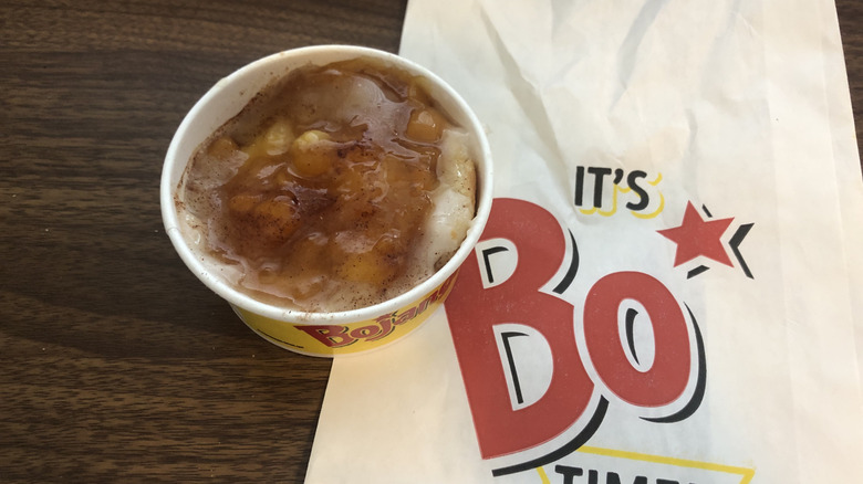 Bojangles offers one of the only fast food pies that does not come in Hot Pocket form. The chain actually refers to it as a cobbler rather than a pie for a more rustic feel. But after inspecting the ingredients, I'd say this dessert sits in a league of its own. Bojangles has taken one of its house-made buttermilk biscuits — which it already happens to have stocked for biscuits and gravy, breakfast sammies, and sweet Bo Berry biscuits — plopped it in a cup, and topped it with peach topping, icing, and cinnamon sugar. The result is intriguing, but there's something about it that seems a little off.