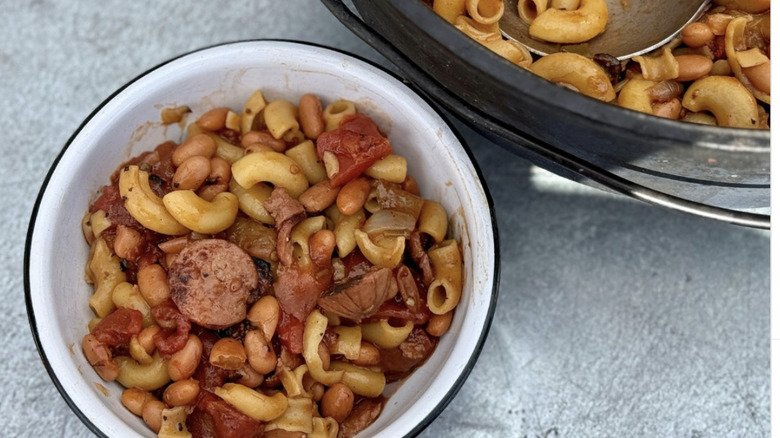 Typically, Hoover stew consists of canned or boxed hot dogs, macaroni, tomatoes, and corn, but thanks to the nature of necessity, these items can be omitted, added to, or swapped out for something else, depending on what's available. Simply boil the ingredients together, cooking the macaroni until it's al dente. If you want to make Hoover stew but are worried it may be a little bland, consider adding flavor through spices, herbs, hearty broths, or acidic ingredients like vinegar or lemon. Adding some fresh vegetables like spinach or kale is a great way to boost the healthiness of the meal.