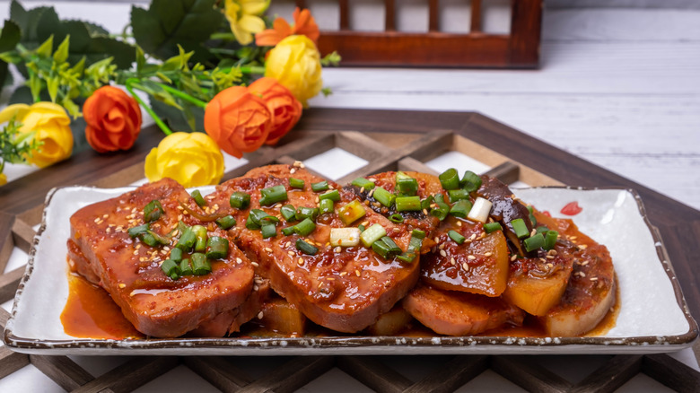 Spam is made from chopped pork shoulder and ham, seasoned with salt, and combined with potato starch and sodium nitrite before being heated and canned. It's still the subject of love and ire today, with Hormel claiming that 12.8 cans of Spam are eaten every second, across 50 different countries. Spam is available in 11 different varieties, from healthier, low-sodium versions to maple, smoked chili, and spiced flavors. Due to its immense popularity in Asia, various Asian-style recipes, such as Korean, teriyaki, and gochujang, are also available. If you're curious, take a look at our taste test of every Spam flavor.