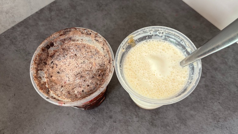 Lastly, we have a pairing that really serves up the best of both worlds — and by that, I really mean the best of every possible Frosty world out there. Oreo brownie twist vanilla Frosty Fusion is certainly a mouthful (both in name and flavor), but it's a phrase I won't hesitate to stumble over the next time I'm in a Wendy's drive-thru. Admittedly, I'm biased as a long-time adorer of cookies and cream ice cream, and the addition of brownie batter swirls into the mix made this treat *chef's kiss*.