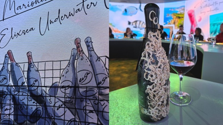 As I finished my last noodle, the surrounding screens took me down the picturesque Spanish coast, before plunging deep beneath the waves, where I was introduced not to my next seafood dish but rather my next wine. There, on the seafloor on the screens that enveloped the room, safely secured in a lock box, were barnacle-encrusted bottles of a very notable wine — a bold 2019 Seastar grenache. As sea life swam about us, graphics played across the screen detailing the process that results in this distinctive wine.