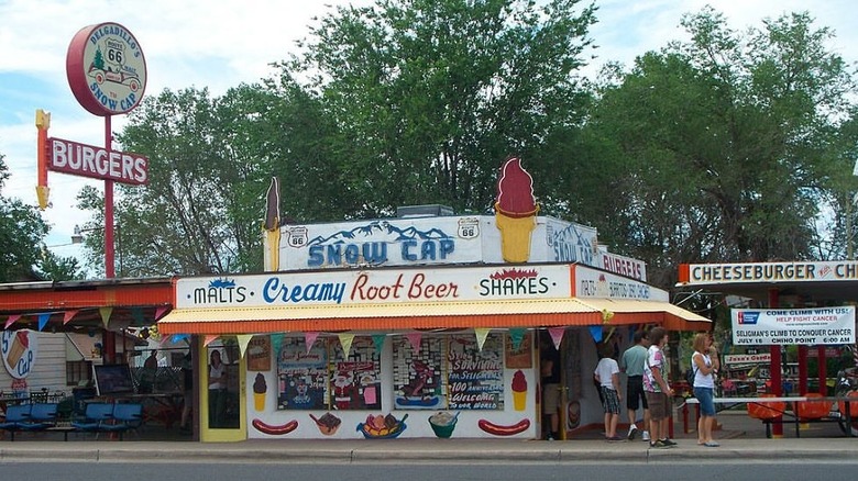 One such location is Delgadillo's Snow Cap Drive-In, a classic American roadside stand serving hot snacks and cool treats. Built along Route 66 in 1953, Delgadillo's Snow Cap Drive-In is known for its quirky sense of humor. Owner Juan Delgadillo was a jokester who included food puns and pranks throughout the menu and restaurant. A sign promoting a "Cheeseburger with Cheese" and doors with fake doorknobs are designed to give visitors their meal with a chuckle on the side. After exploring Seligman, cool off with a milkshake—Delgadillo's holds the Guinness World Record for the most varieties of milkshakes served.