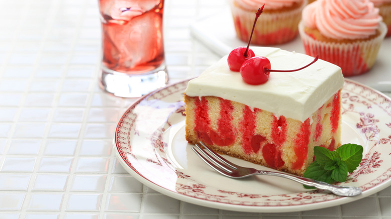 Nobody likes a dry cake, but some of us are extra enthusiastic about an ultra-moist texture — it simply feels more decadent and indulgent. While there are many different types of juicy cake out there, one of the coolest is a blast from the past: poke cake. It's basically a standard sheet cake that you poke medium-sized holes in (hence the name) after the base is baked. Then, you pour a liquid of your choice over the cake to fill the holes, which makes it super moist and also brings additional flavor to the party. What you choose to pour over the cake often ends up being the most defining piece of the entire dessert.