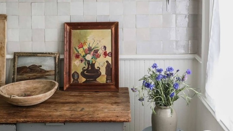 Give your kitchen a little bit of class by displaying vintage art. While kitchen art isn't necessarily practical or functional, it will make your kitchen uniquely your own. You don't have to spend a lot of money – you can find affordable kitchen decor and art in unexpected places like flea markets and thrift stores. Look for pieces that speak to you the next time you're out thrifting, or take a few pieces of art from elsewhere in your home and see how they look on the walls or shelves of your kitchen.