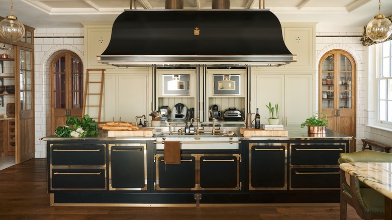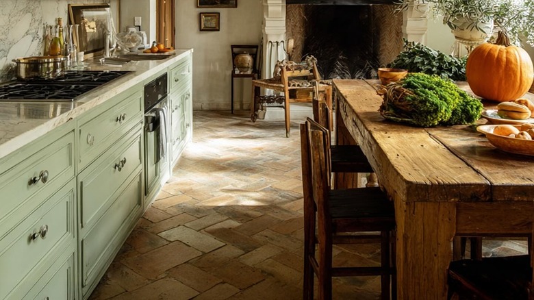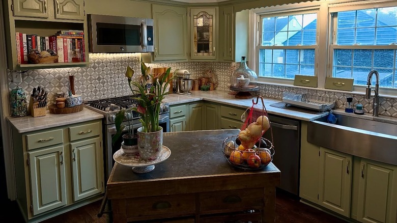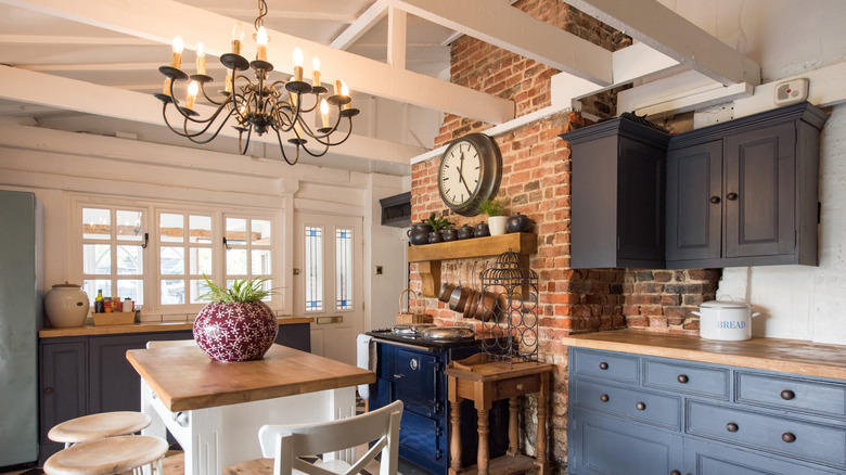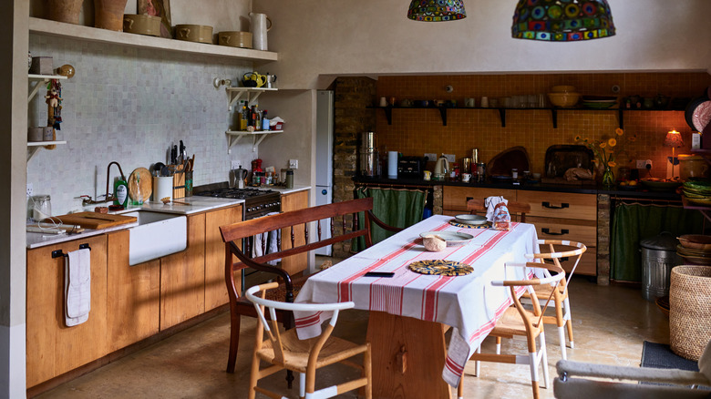 While there are huge differences between classic country kitchens, Cottagecore kitchens, and modern British kitchens, you can still draw inspiration from country and Cottagecore designs. The Cottagecore aesthetic was inspired by English countryside homes and focuses on creating a warm, cozy, and inviting atmosphere. Think Kate Winslet's charming cottage kitchen in "The Holiday." Explore examples of Cottagecore design online, and take what you like and leave what you don't. Experiment with the varying colors, patterns, and textures that are staples of country and Cottagecore kitchens and explore thrift stores for vintage textiles.