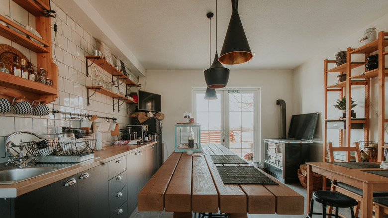 Something you have probably noticed when looking at British kitchens in movies and TV shows is that most of them have a large, utilitarian work table rather than a kitchen island. In the true spirit of practicality and simplicity of design, a work table serves multiple purposes in a kitchen. You can use it for food prep, dining, or storage. Choose one that is heavy-duty, solid, and durable as you will be using it every day.
