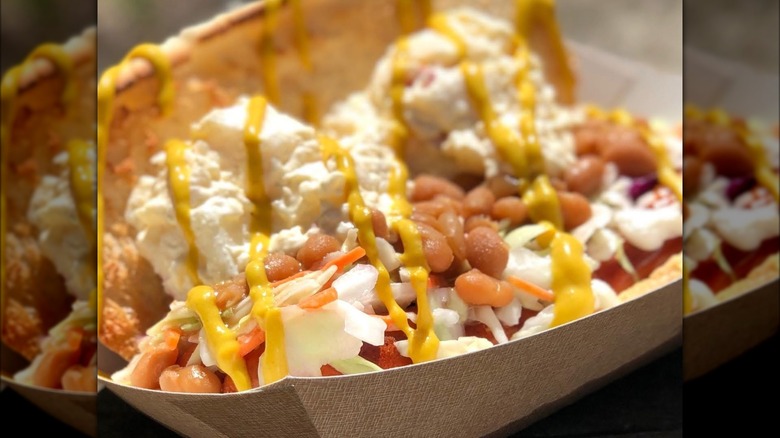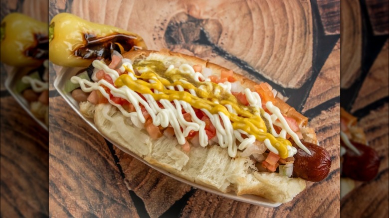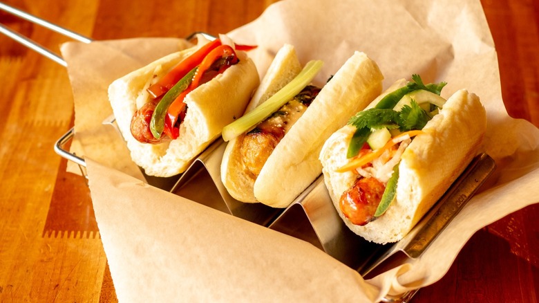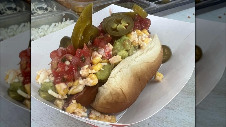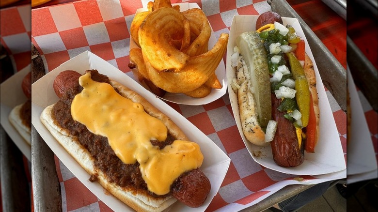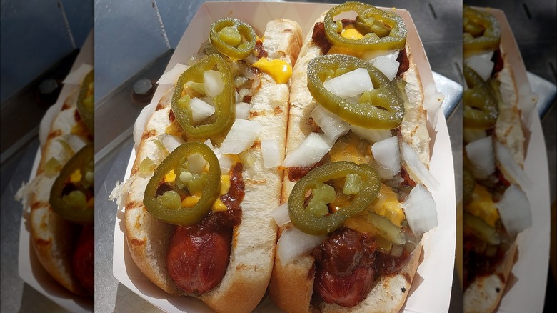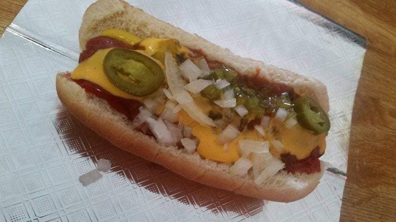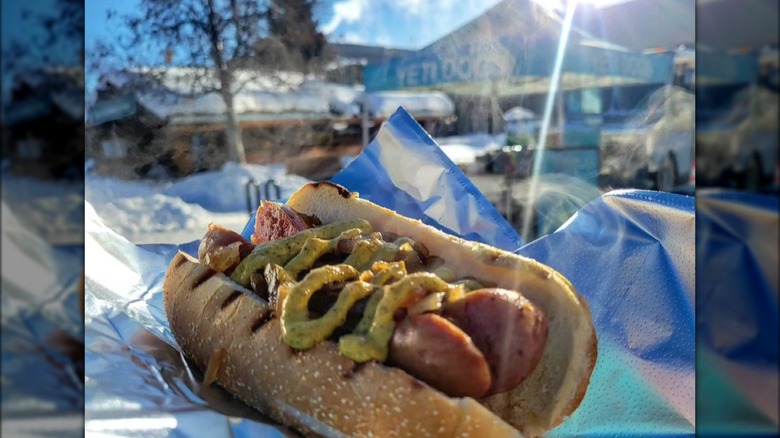 Tracking down Alaska's Yeti Dogs might take a little work, as it's a food truck that moves around Anchorage. Finding it is worth it, though, since it's a fan favorite. The menu is straightforward with options like all-beef dogs, bratwurst, Louisiana Hot Links, and even a vegan option. No self-respecting Alaskan hot dog joint would skip on the state's iconic reindeer dogs, either — and yes, they're here. Don't doubt this truck's dedication: It's often seen out in below-freezing temps.