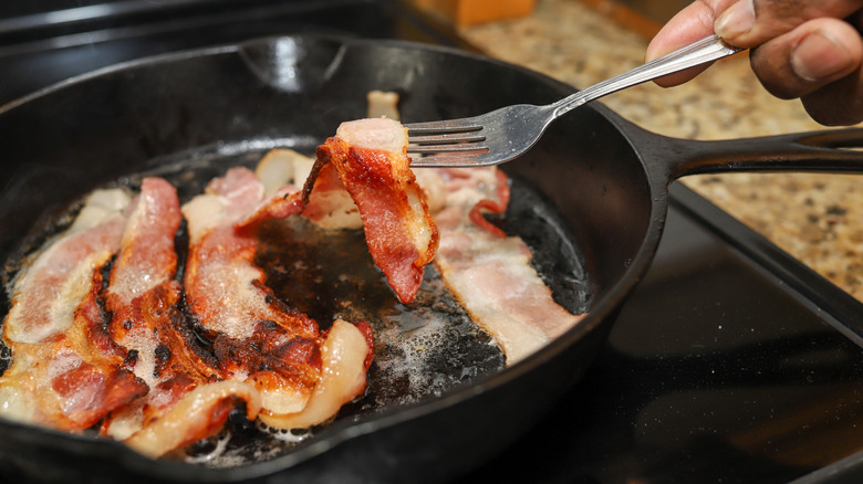 Even after tossing it in at the last moment, there are a few extra tricks to help bacon stay crisp throughout your meal. Start with thick-cut bacon, which tends to hold its texture longer than thin slices. Cook it until it's nicely crisped and has that gorgeous umami aroma. The key is rendering out as much fat as possible while cooking at a slow pace at lower heat — less moisture in the bacon means less sogginess later. Another tip is to consider baking the bacon instead of frying it. When baked on a wire rack over a sheet pan, the fat drips away and the heat circulates evenly, creating a uniform crispness. Once cooked, let it cool completely before adding it to your salad. Hot bacon can steam and soften, even if added late. A quick re-crisp in the oven, skillet, or air fryer before serving — especially if it's been stored in the fridge — can bring it back to life.