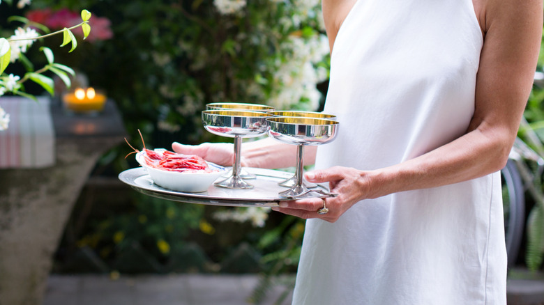 Becoming acquainted with serving trays is really just the first step in this effortless hosting hack. Next, comes learning how to make the absolute most of them. First, consider your menu – Ina Garten has an easy party menu that she could make in her sleep. Use the trays to group together the different items you're serving. For example, create a separate tray for appetizers, mains, and sides. A drink tray is a must, too. If some of the guests have dietary restrictions, build trays that cater to vegetarian or gluten-free guests. Having the dishes categorized allows for smoother sailing as you won't get bombarded with constant questions about which dishes are where.