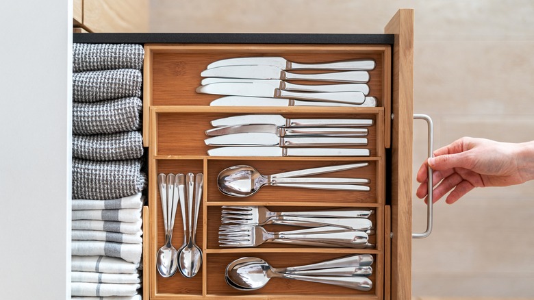 Cleaning your cutlery tray depends on its material. Plastic trays are the easiest to handle — you can wipe them with vinegar or spray cleaner, soak them in warm soapy water for stubborn grime, or place them in the dishwasher. For wood, metal, or basket-style trays, shake out crumbs and wipe with a clean cloth. If the tray allows crumbs to fall through, like mesh or rattan, vacuum the drawer before placing it back. To disinfect, use a cloth dampened with vinegar. Wipe down the inside of the drawer too, especially the corners. Once everything's dry, reassemble its contents.