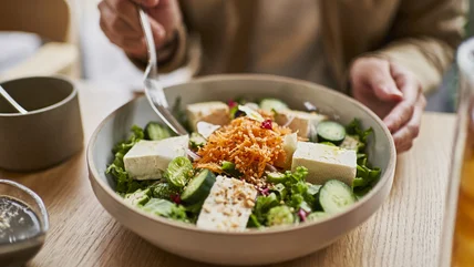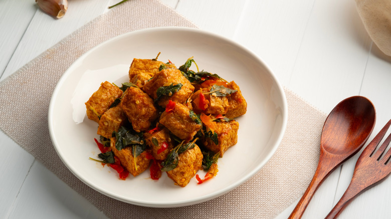 If you're craving eggs, for example, tofu can be mashed and scrambled and combined with ingredients like black salt (for that sulfurous, eggy flavor), turmeric (for the yellow color), and nutritional yeast (for umami), before being cooked in a pan and served over toast. Tofu is also good at soaking up the strong flavors from curries, hot sauces, and marinades. Plus, if you fry, air-fry, or bake it with oil and cornstarch, you'll also create a tender, crispy, and almost chicken-like texture.