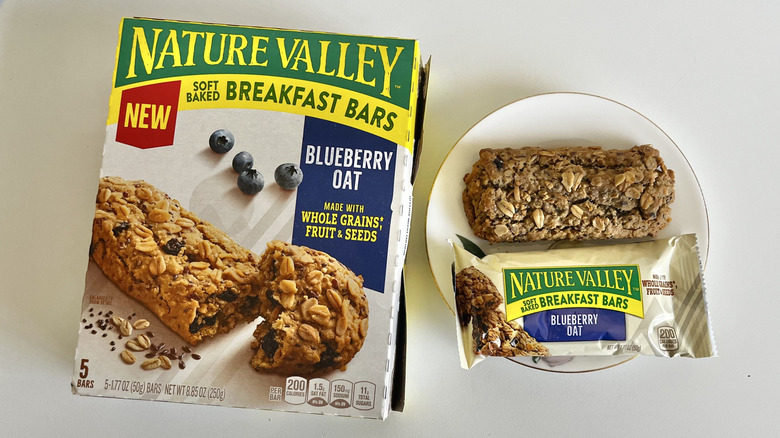 There are a few oats on top to give a touch of crunch and added mouthfeel, but the interior is softer — this is also where you'll see the occasional flax or chia seed included. It's easy to take a nibble or break off pieces to eat. However, don't confuse the breakfast bars with the Soft-baked Blueberry Muffin Bars, as they look very similar on the shelf. And if you're ordering via an app, it can be easy to confuse the two when typing in "Nature Valley blueberry bar" or something of that nature.