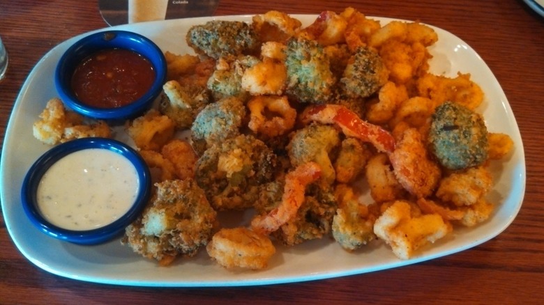Most of the time, you're not going to get a serving of veggies when you order fried calamari, but at Red Lobster, you used to be able to order just that. It was the calamari with broccoli and peppers, which featured both the veggies and calamari coated in a light and crispy breading. It also came with a chipotle dipping sauce that made this dish a bit more unique than the type of fried calamari you might get at, say, an Italian restaurant. Admittedly, it was an unconventional dish that kind of seems cheap — after all, broccoli and peppers are cheaper to serve than calamari. But, the dish was nonetheless beloved. One Reddit user noted that they missed the old recipe with the broccoli, claiming that the calamari that was on the menu at the time "sucks."