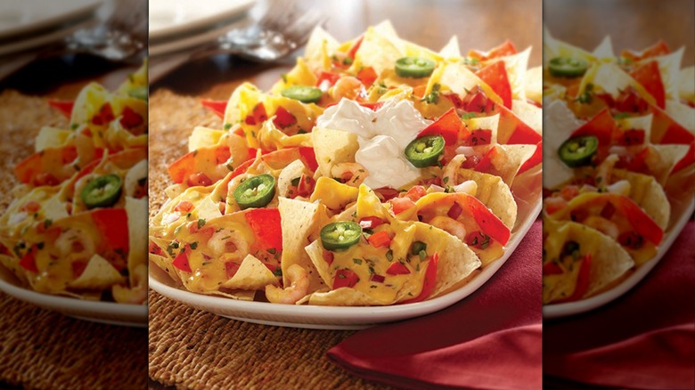 A lot of us think of beef, chicken, or pork when we imagine a plate of nachos. But it shouldn't come as a surprise that at Red Lobster, nachos were once piled high with shrimp. It all started, like every plate of nachos does, with a bed of tortilla chips. Then came the shrimp, along with jalapeños, cheese, sour cream, and salsa. Ultimately, it was a fairly classic nachos dish, but the fact that you could order it at Red Lobster was, seemingly, a novelty.