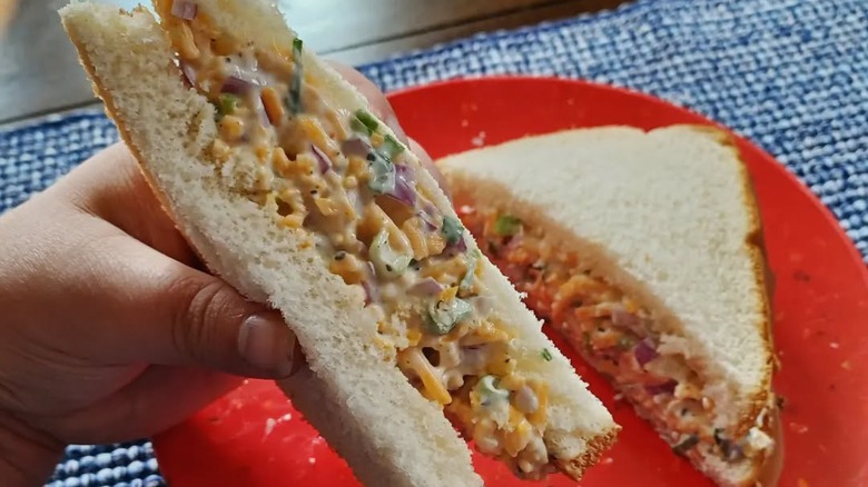 Although it isn't spicy, cheese and onion filling isn't a million miles from the pimento cheese of Appalachia and the Southern U.S. It's a mixture of grated cheese, mayonnaise, onion, and sometimes grated carrot, all served between two pieces of bread (usually the cheap, sliced variety). It might not sound like a culinary masterpiece if you've never tried a cheese and onion sandwich, but it's perfect comfort food — rich, creamy, tangy, and easy to shove in your gob in about five bites.
