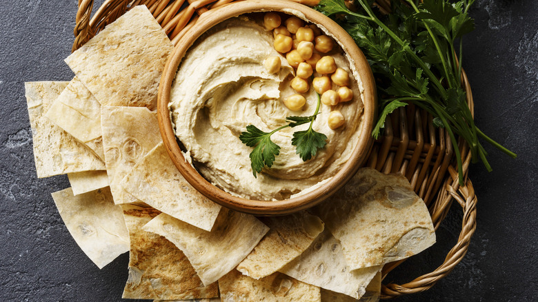 For someone like me who grew up in a Middle Eastern household, hummus and pita bread was the snack of choice on most days. When you're feeling hunger pangs at any time of the day, a little bit of pita bread with a spoonful of hummus is incredibly satisfying. It's savory, rich, and nutty, and can feel like more of a nutritious snack than reaching for potato chips or candy. Many people in the U.S. see hummus as a dip for carrots and other crudités. This is definitely a fresh and healthy way to go about it, but in terms of pure deliciousness, pita chips and hummus are unmatched. Pita chips are made from toasted or fried pita bread pieces. They're crunchy, salty, and a sturdy carrier for hummus. They feel authentic to my pita and hummus childhood snack plate, but with a modern and fun twist.