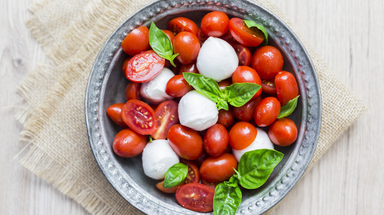 There are so many reasons that tomatoes and mozzarella should be brought together. We love them on pizza, pasta, in sandwiches, and in salads. They are such a natural pairing, you'd think they were created to be enjoyed as one. For many home cooks, fresh tomatoes and some mozzarella cheese are two fridge and pantry staples. Pairing them together isn't an innovation, but they have truly stood the test of time. Sweet, acidic tomatoes with some creamy mozzarella is a winning snack, no matter how you serve it. But the best thing is that there is so much versatility in the ways of serving.