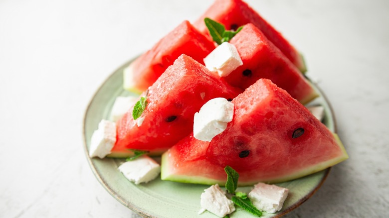 When it comes to plating these two foods, there are absolutely no rules. Many prefer to make a salad with cubes of watermelon and feta dressed with some balsamic vinegar and even some fresh mint. But to make a quick snack plate, you can just as easily place a couple cubes of feta on a plate with some pieces of watermelon, and that's that. Or, take your presentation up a notch by making these watermelon and feta tea sandwiches. Cut your watermelon into little rectangular slices to mimic bread. Then fill two of those slices with feta to make your "sandwich" filling.